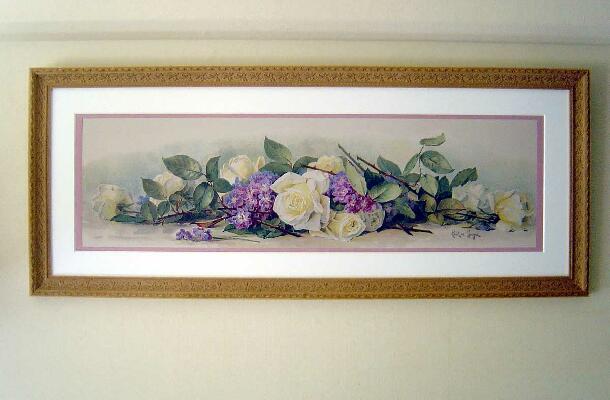 薔薇と紫陽花がどこかアンティークな雰囲気に陰りを帯びたシックな色調で描かれたワイドサイズの額絵です。明るめのブラウンの高級フレームはどこかコッツウォルズのほっこりとした蜂蜜色の村を思い出させてくれました。