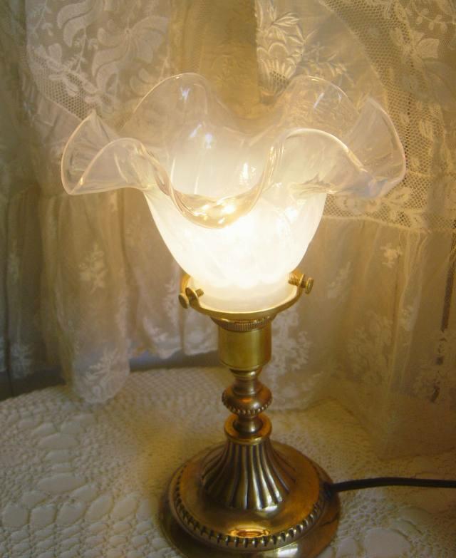 * ひとつひとつフランスのガラス職人によるハンドメイドのガラスシェードは、作る職人によって乳白色の入り方等が異なるため、乳白のヴェールが全体に強めの仕上がりの時と、下の画像のシェードのようにやや透明度が高いふわっとオブラートをかけたような仕上がりの時とがあり、乳白の入り方、フリルの仕上がり等にハンドメイドならではの個体差がありますが、実際にランプを灯してみると、乳白が強めのもの、やや透明度が高いもの、どちらもそれぞれ甲乙つけがたく、アンティークテイストのニュアンス、雰囲気があって素適です。フランスのガラス職人によるハンドメイドのガラスシェードならではの特性をご理解の上、お求めいただけますようお願いいたします。