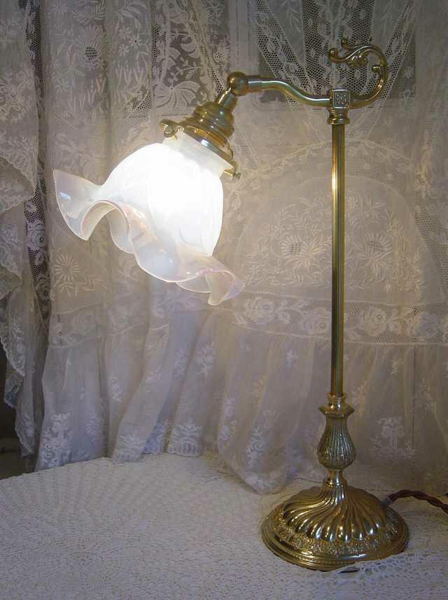 * ひとつひとつフランスのガラス職人によるハンドメイドのガラスシェードは、作る職人によって乳白色の入り方等が異なるため、乳白のヴェールが全体に強めの仕上がりの時と、下の画像のシェードのようにやや透明度が高いふわっとオブラートをかけたような仕上がりの時とがあり、乳白の入り方、フリルの仕上がり等にハンドメイドならではの個体差がありますが、実際にランプを灯してみると、乳白が強めのもの、やや透明度が高いもの、どちらもそれぞれ甲乙つけがたく、アンティークテイストのニュアンス、雰囲気があって素適です。フランスのガラス職人によるハンドメイドのガラスシェードならではの特性をご理解の上、お求めいただけますようお願いいたします。