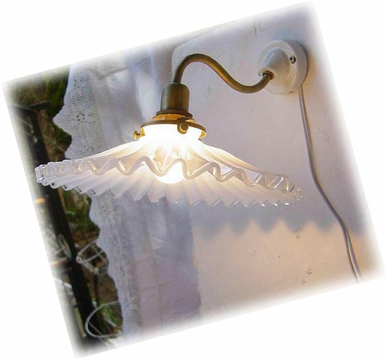 壁面の好きなところに電気工事なしに簡単に取り付けられるとっても便利な簡易式ブラケット(ウォールランプ)&ミルクグラスのフレンチフリルシェード(A-French-MG)のセットでのご紹介。