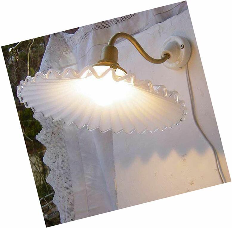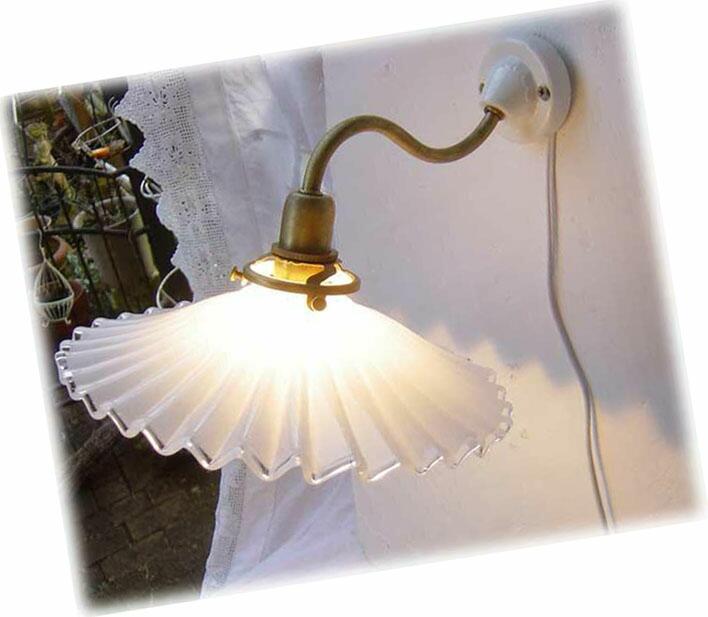 コンセント仕様の簡易式ブラケットはシャビーなアンティーク仕上げとなっており、陶器でできている壁プレート用台座もアンティークテイストでとても素適です。ガラスシェードが斜め前方を向くようにデザインされているので、フレンチフリルシェードを合わせてみたら、とっても可愛いです!