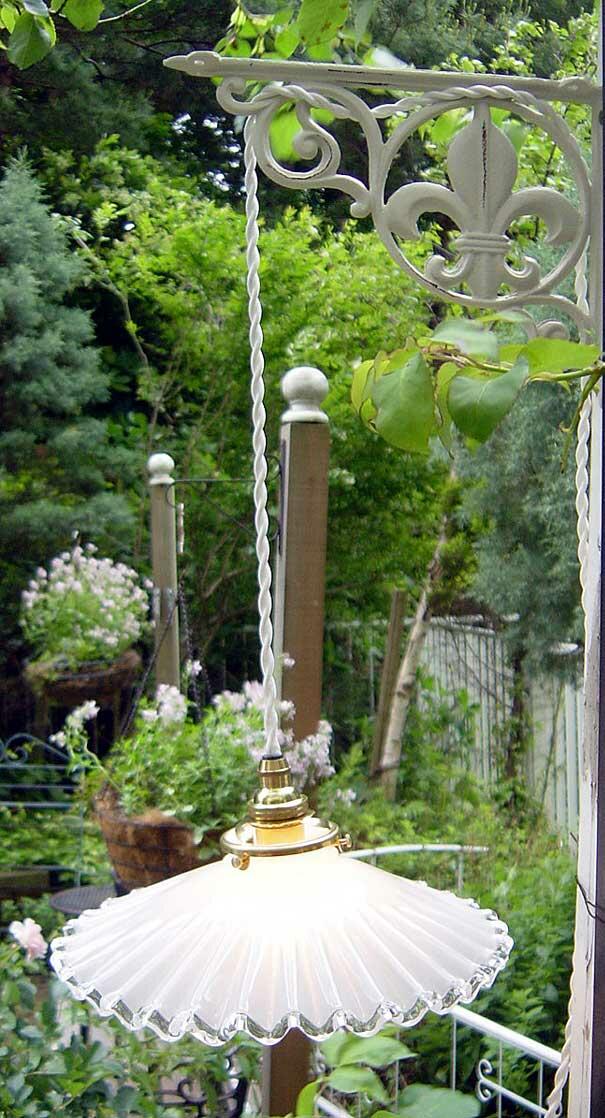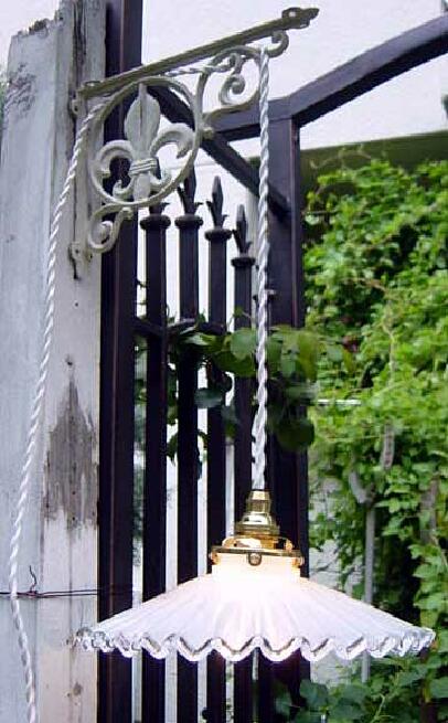 アイアンブラケットにはフランスアンティークテイストたっぷりの真鍮のコード器具(コードの色はフランスアンティークタイプの白のみとなります。配線3mとなっています。)を取り付け済みとなっています。コードの先はソケットになっていますので、壁面のコンセントでご使用くださいね。(メーカーのほうで中間スイッチをつけることまでができないため、コンセントから抜いたり、つけたり、そこがちょっと不便なのですが(- -, )壁の好きなところにも取り付けられるこのこの簡易ブラケットをとっても気に入ってしまって、電球を回してつけたり、電球をゆるめて消したりとっても原始的な仕方で楽しんでいます (*^_^*)。 フランスやイギリスの本物志向の方へは本館ランプシェード売り場の真鍮のブラケットがお勧めですが、気楽に好きなところに照明を下げたい方はぜひこちらの簡易式フレンチブラケットをお使いになられてみてくださいね。(なお、取り付け用のネジ、釘等はホームセンター等でお求めくださいね。)